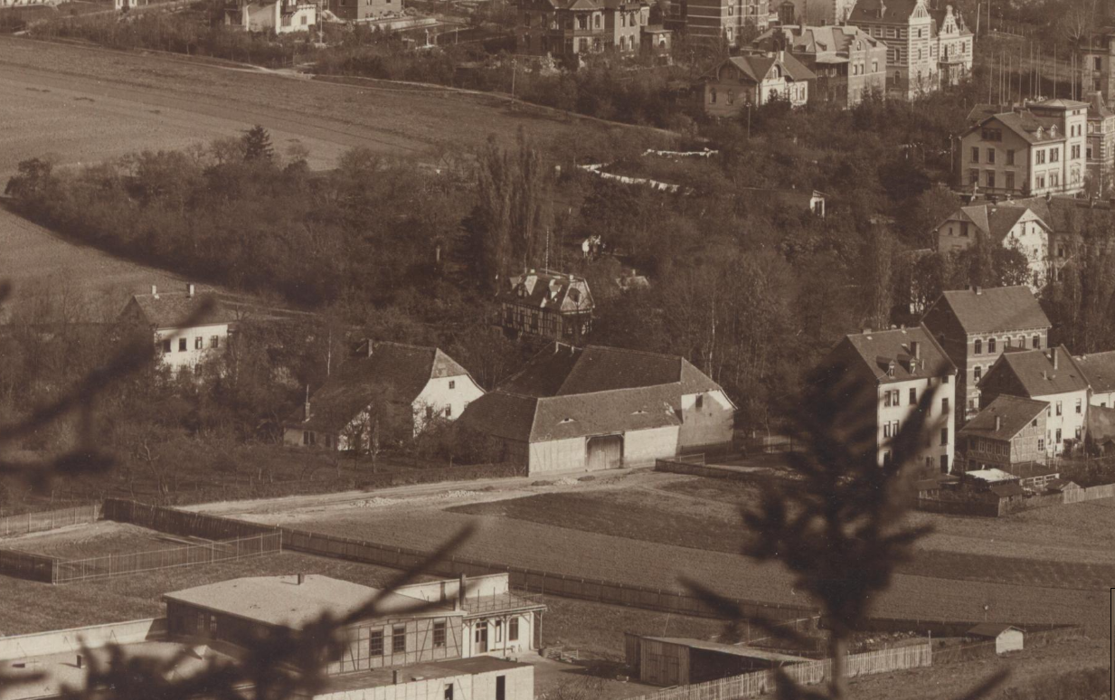 In der einzigen mir bekannten Aufnahme sieht man die Naumühle, gegenüber liegen die Gebäude der Talstraße 35, 31, 29 und 25. Auch das große Backsteingebäude existiert noch, es ist heute das Gasthaus "Leutraquelle".